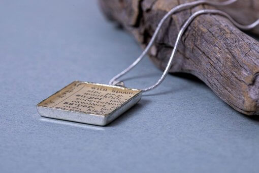 The recycled paper is encased in a special resin that keeps it safe and protected from the elements. This handmade love gift is complete with a silver sterling chain, and you can choose from one of three lengths.